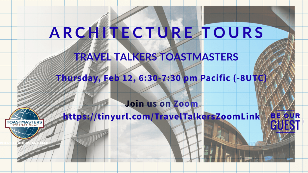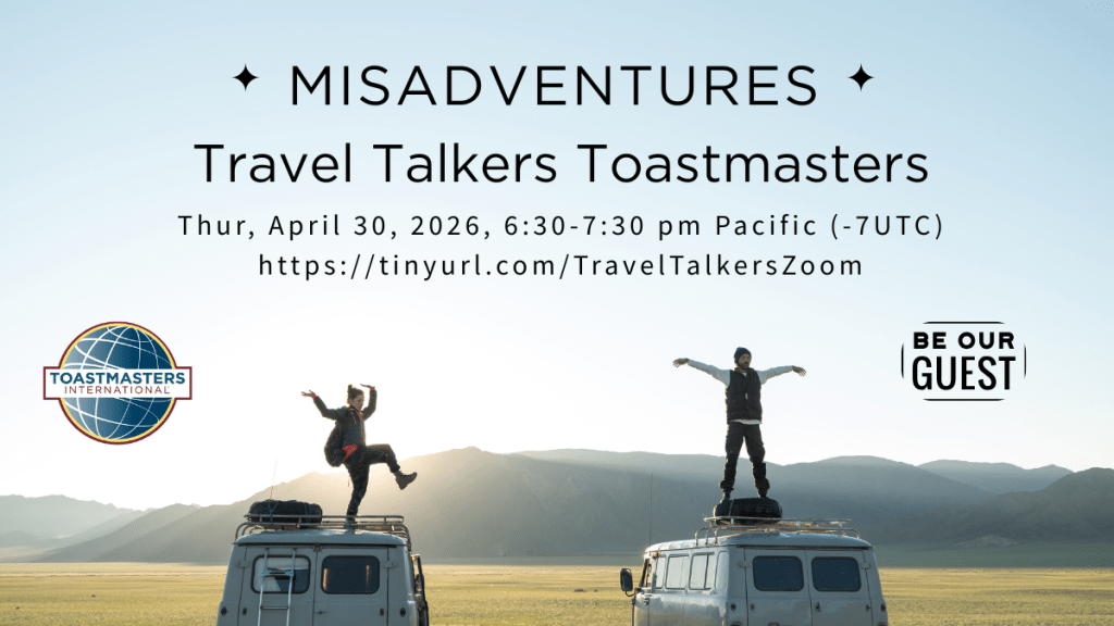 If you love to travel and share stories about your adventures, Travel Talkers Toastmasters is the club for you. All are welcome to join the Open House meeting on Thursday, October 24th from 6:30-7:30 pm Pacific (-7 UTC).