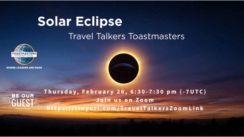 We invite you to Travel Talkers Toastmasters on Thursday, February 26th, from 6:30 to 7:30 p.m. Pacific (-8 UTC). Our meeting theme is “Solar Eclipse.” Join us to share your travel adventures.