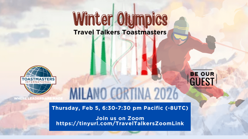 We invite you to Travel Talkers Toastmasters on Thursday, February 5th, from 6:30 to 7:30 p.m. Pacific (-8 UTC). Our meeting theme is “Winter Olympics.” Join us to share your travel adventures to attend the 2026 Winter Olympics in Italy.