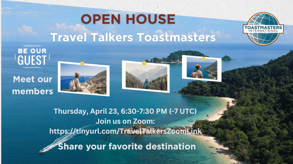 We invite you to Travel Talkers Toastmasters on Thursday, April 23, from 6:30 to 7:30 p.m. Pacific (-7 UTC). Our club is hosting an Open House. Join the meeting to meet our members and share your favorite destinations.