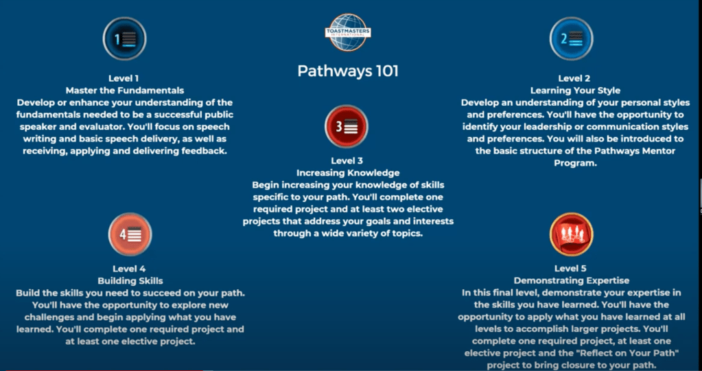 Within Toastmasters, Pathways is the educational program we follow to become better speakers, evaluators, and leaders. As part of this program we learn about our own communication and leadership styles and we learn how to recognize those styles in others. The speaking projects in the program encourage us to try new skills in our speeches such as using vocal variety and body language or adding humor to a speech. The levels within each of the Paths in the program build our confidence and skills.