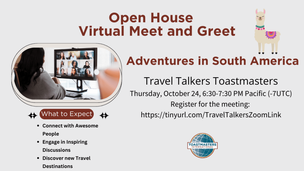 If you love to travel and share stories about your adventures, Travel Talkers Toastmasters is the club for you. All are welcome to join the Open House meeting on Thursday, October 24th from 6:30-7:30 pm Pacific (-7 UTC).